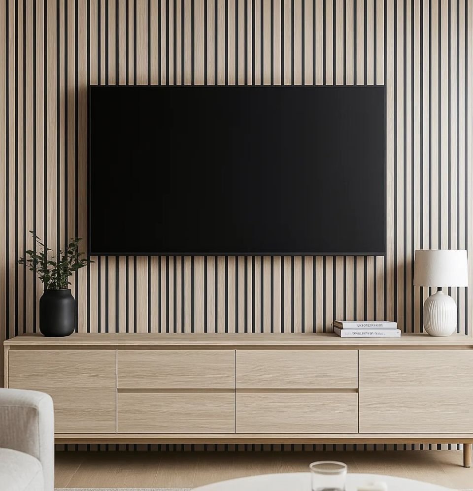 Give your interior a fresh and contemporary upgrade with Model 2025 White Oak . The light wood grain combined with black felt spacing creates a stylish contrast and an airy feel on the wall. The unique narrow-to-wide slat pattern creates a playful rhythm that complements any room.