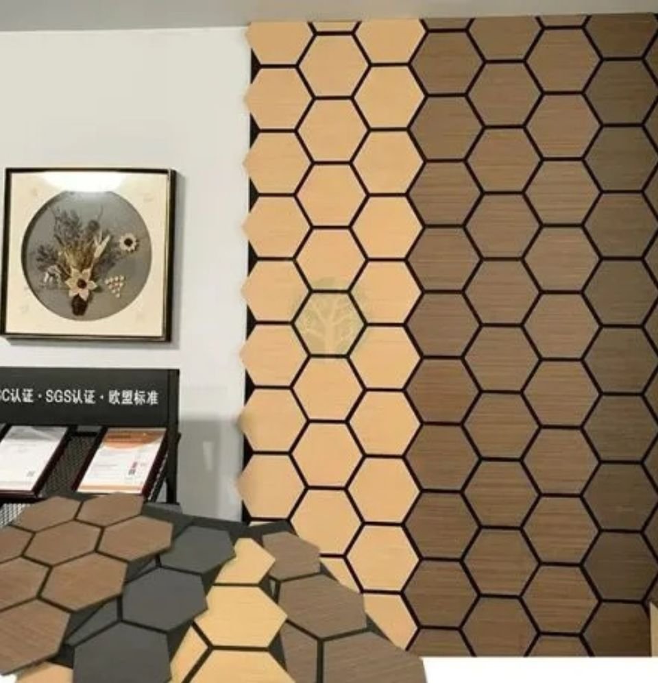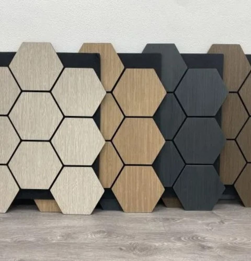 Prachtige Hexagon panelen gecombineerd met een robuuste achterkant van vilt zijn een meerwaarde voor elke muur. De Hexagon panelen wand zorgen voor warmte, sfeer en natuurlijk een moderne uitstraling. Deze panelen zijn overal binnenhuis te monteren en hebben tevens een gunstig effect op het geluid in de ruimte.