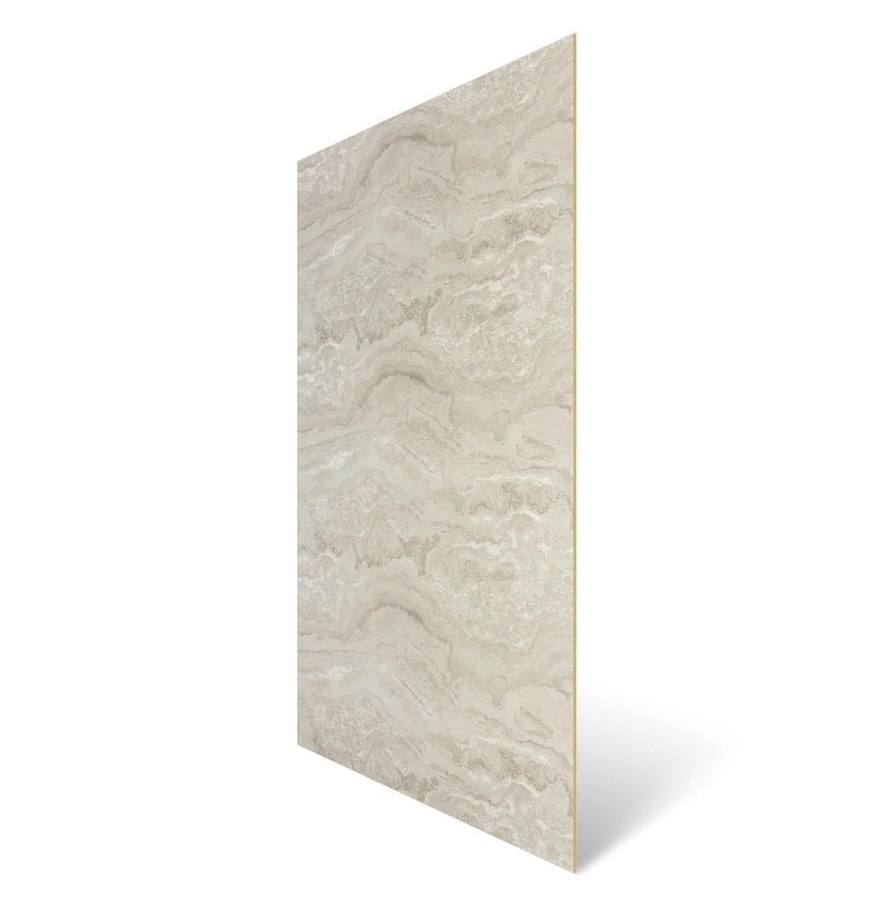 Het zilvergrijze enkele wandpaneel heeft een prachtige onyx marmerlook met wolkachtige wervelingen. De kleuren variëren van lichtgrijs tot middengrijs, aangevuld met taupetinten.